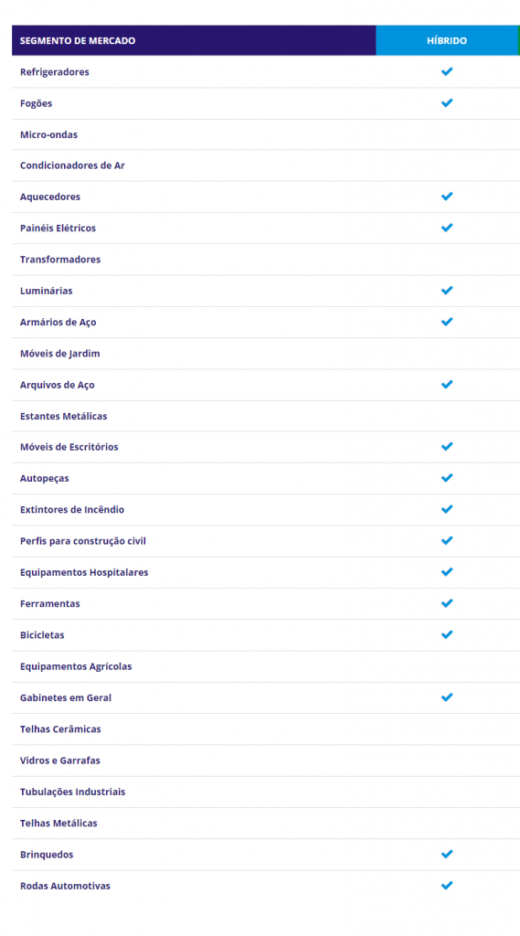 Recomendamos em revestimentos de peças industriais de uso interior bem como decorativa onde o bom alastramento é necessário. As tintas híbridas possuem alta qualidade de acabamento com excelente resistência química.